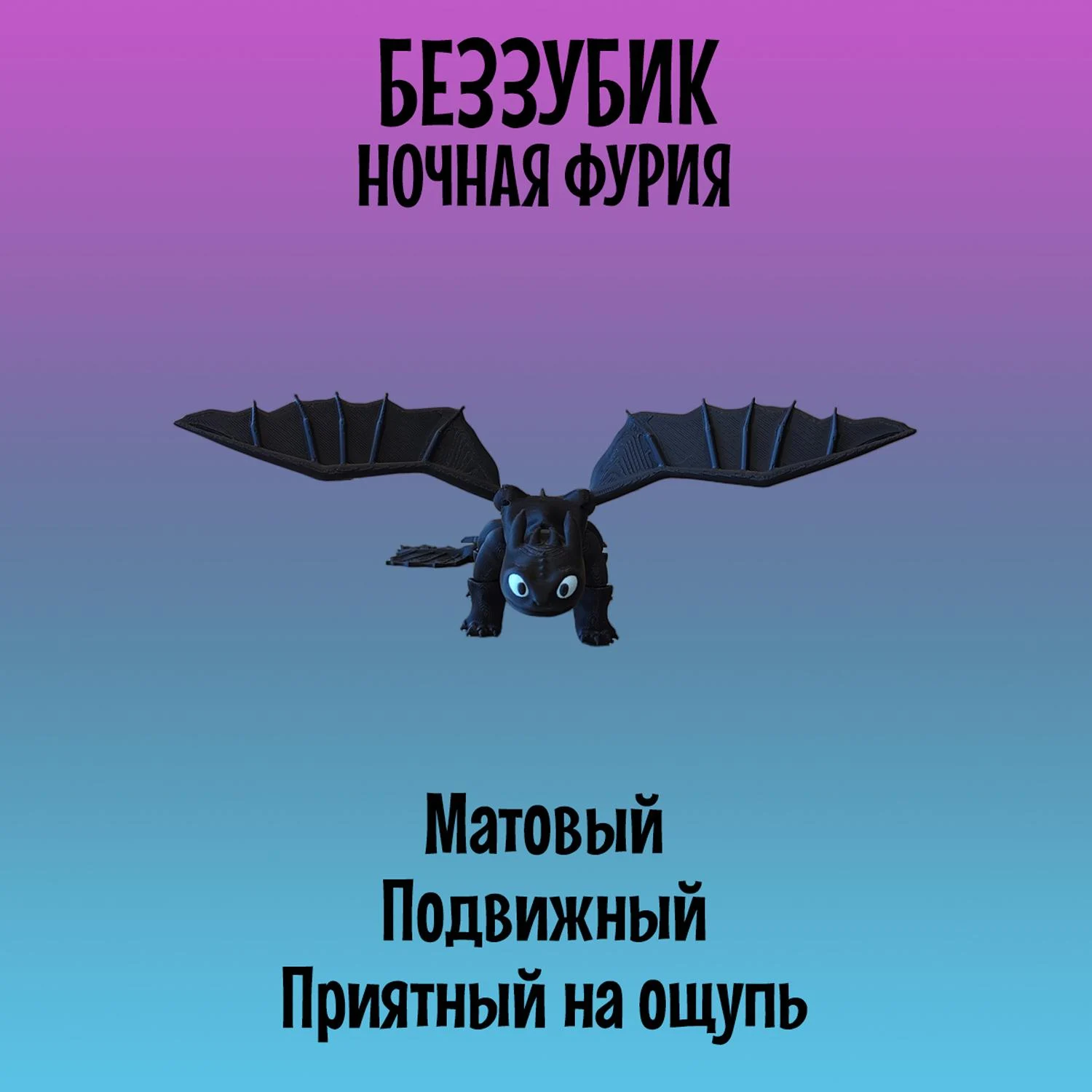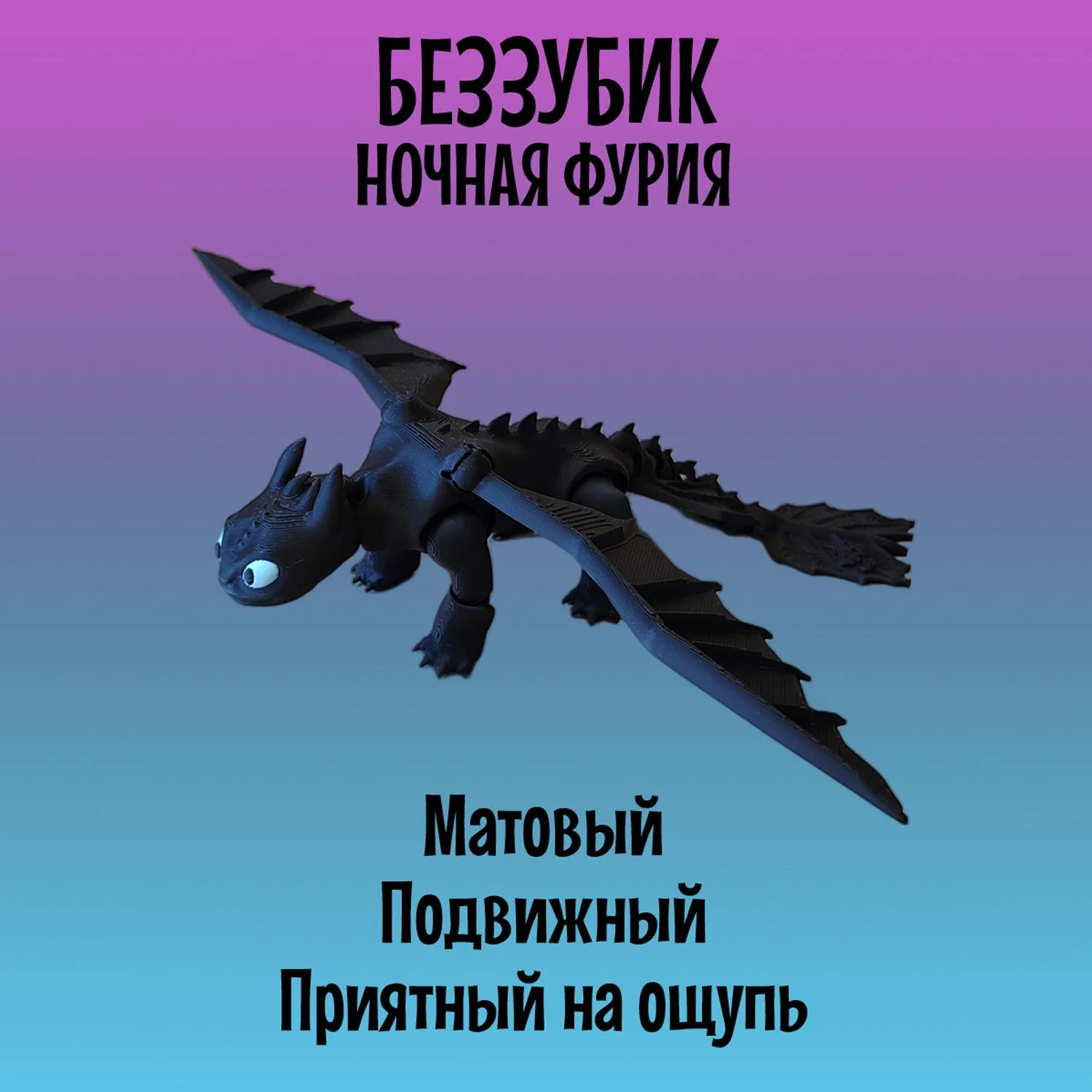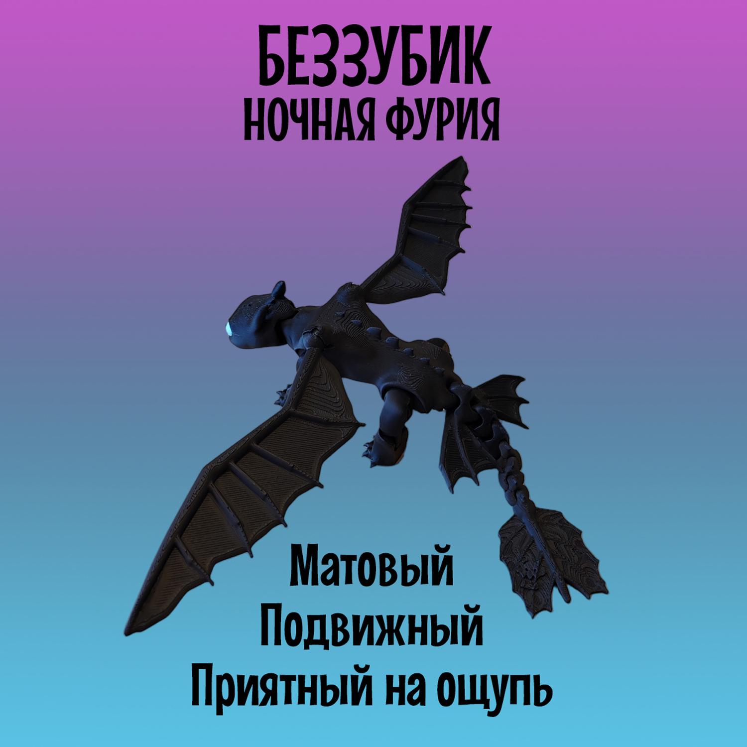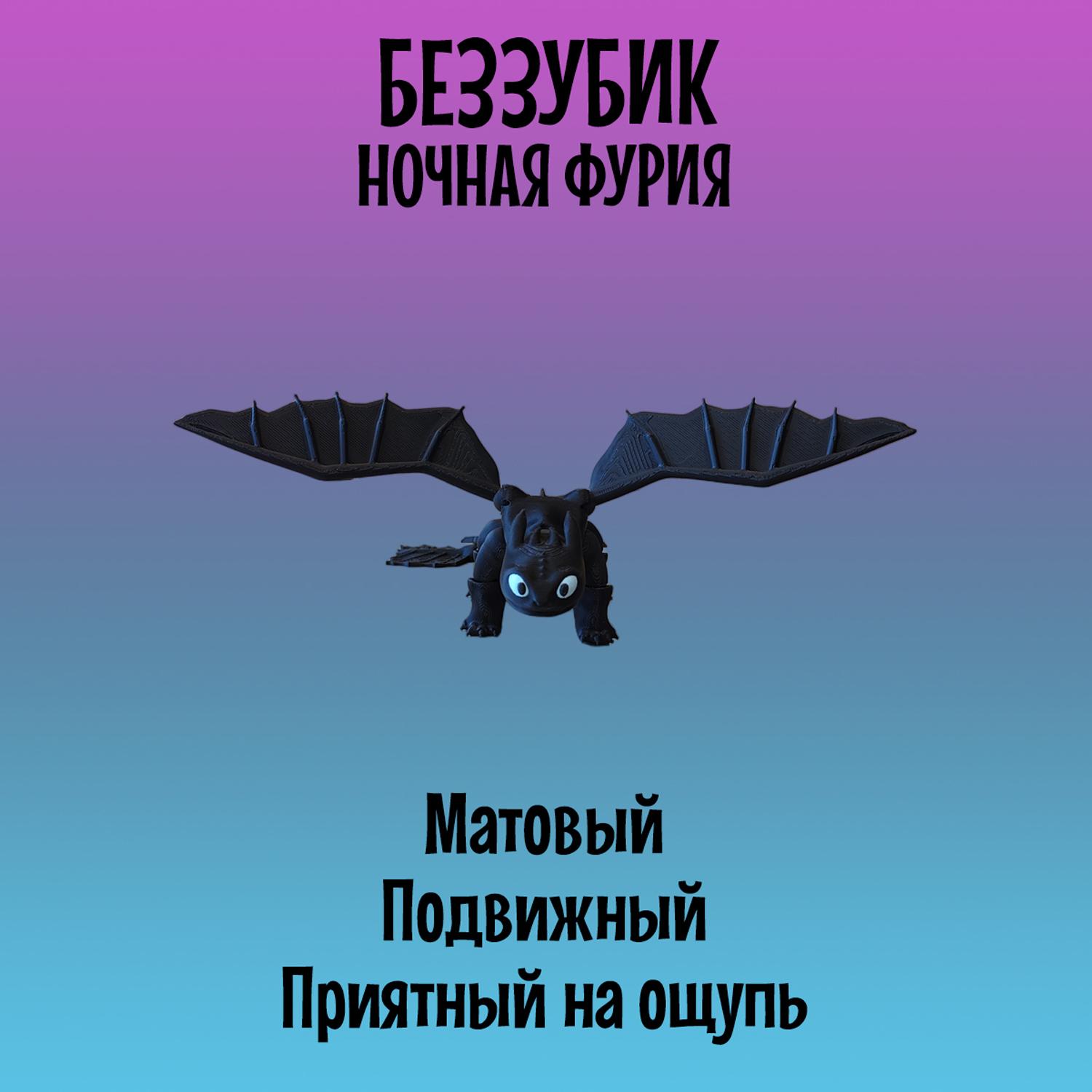 Легендарный Дракон Беззубик из мультфильма "Как приручить Дракона" станет приятным подарком как для детей, так и для взрослых. Модель создана с использованием 3D-печати и отличается реалистичным дизайном и высокой подвижностью элементов: голова, лапы и хвост-полностью подвижный и тактильный, а съёмные крылья имеют шарнирные крепления, что позволяет размещать их в самых разных позициях, создавая эффект реалистичных движений. Игрушка Ночная фурия имеет удобные размеры: 21см в длину и размах крыльев 27см, в высоту стоя на лапах 6см. Выполнена с использованием многоцветной печати из безопасного и экологичного PLA-пластика, который изготовлен из кукурузы и сахарного тростника. Идеально подходит для украшения интерьера, настольного аксессуара, коллекционирования, а так же для игр детей старше 5 лет. Фигурка не боится воды, так как все детали в том числе и голубые глаза напечатаны из пластика и не сотрутся и не потускнеют со временем. Подвижная игрушка антистресс надёжно и бережно упакована в защитную плёнку и в индивидуальную картонную коробку, что отлично подойдёт для подарка. Приобретая нашу игрушку Беззубик, Вы точно останетесь довольны! В каждой коробке есть подарок-сюрприз.