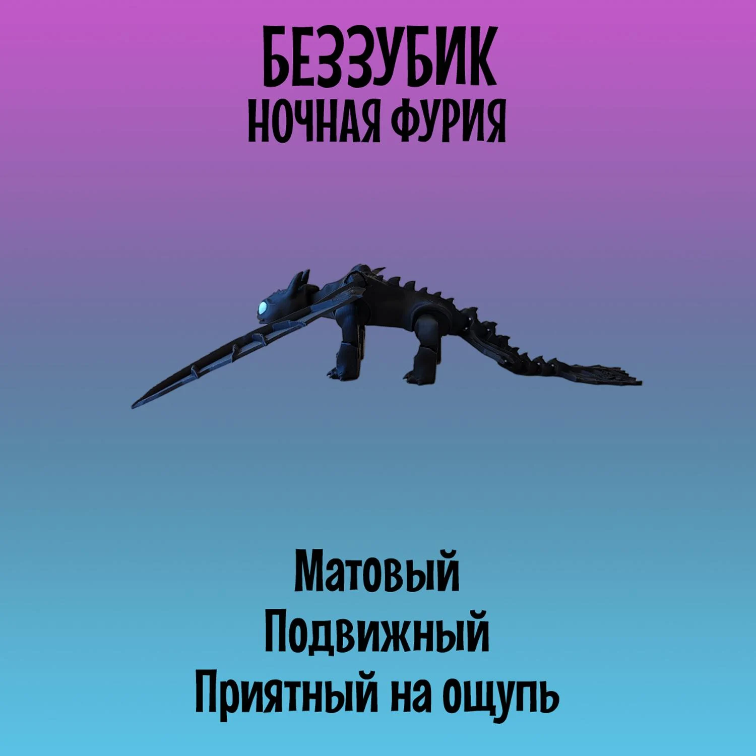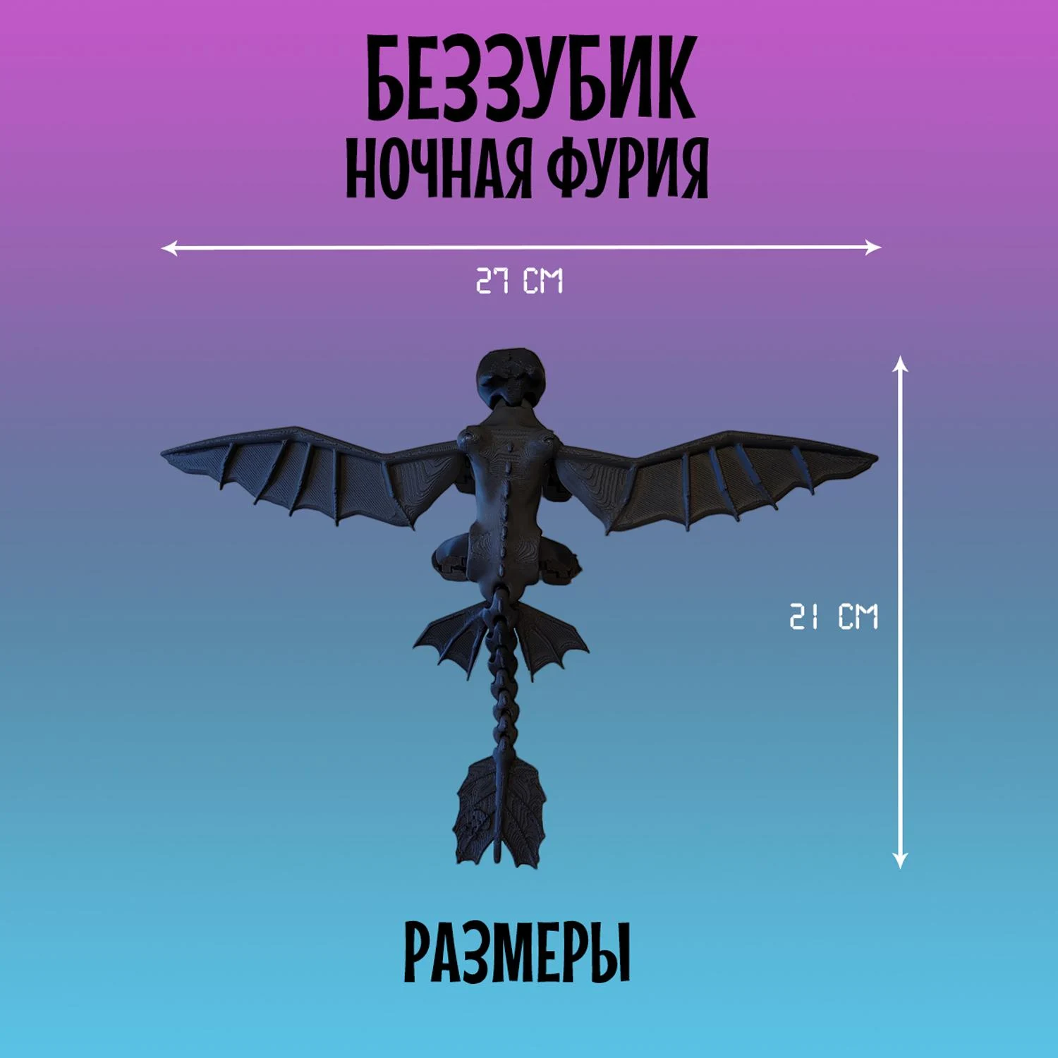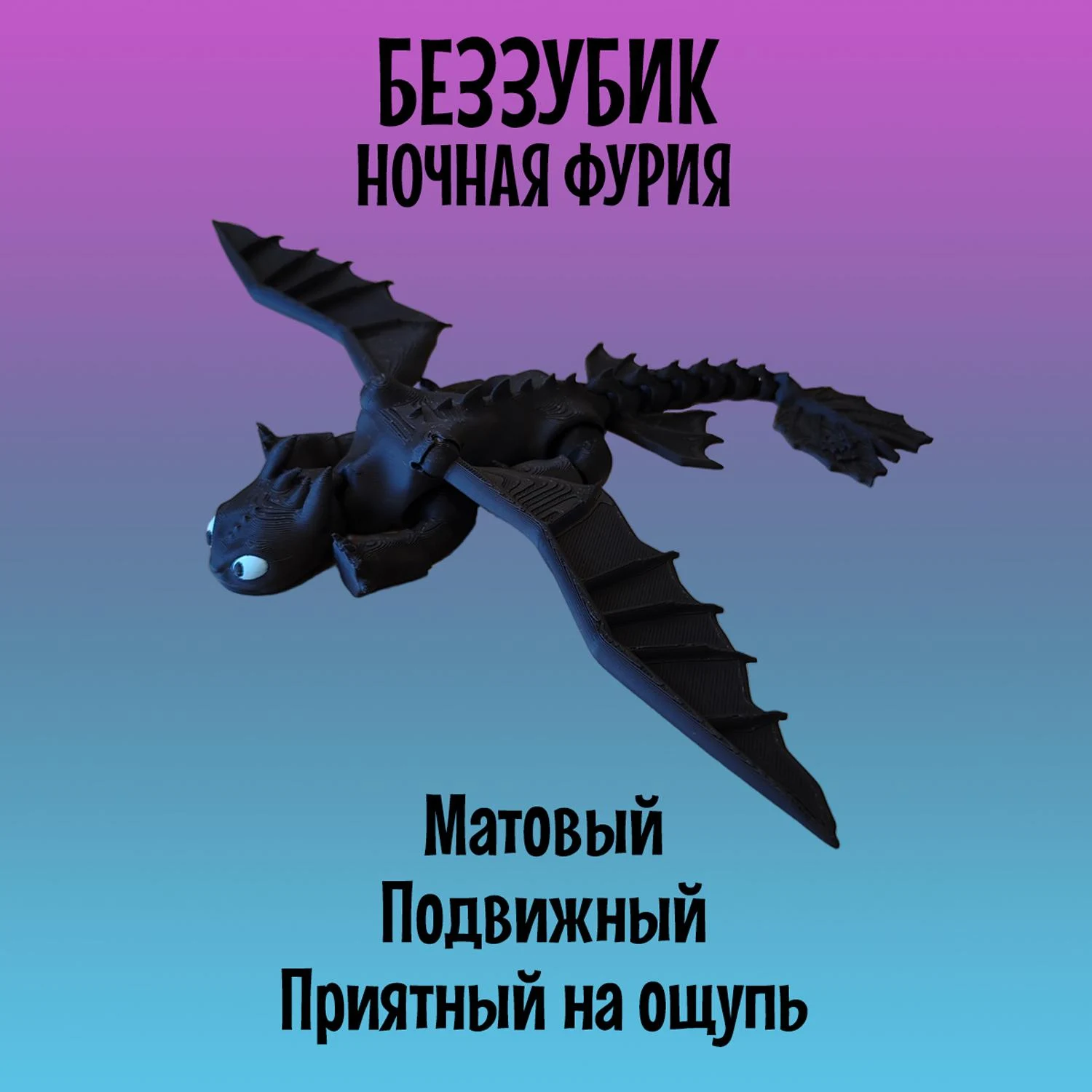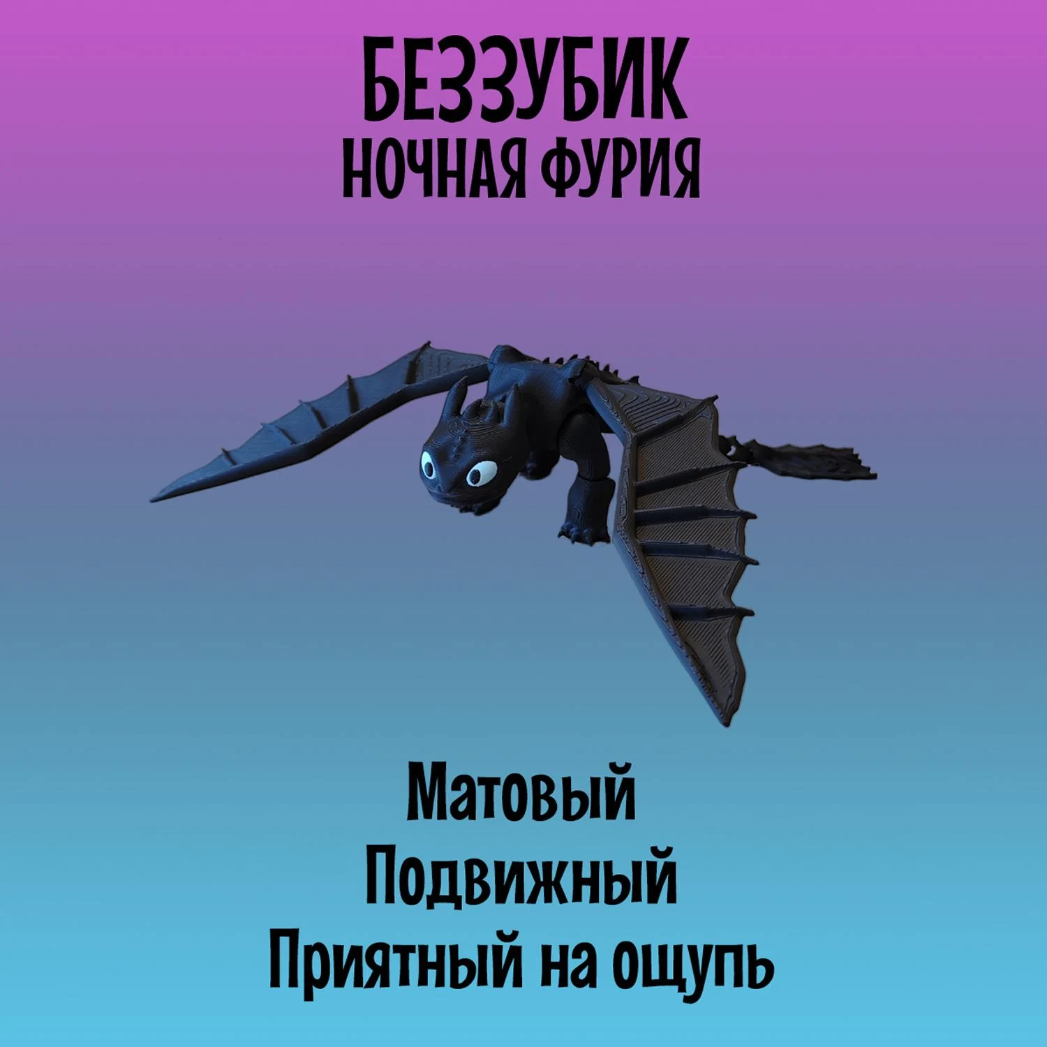 Легендарный Дракон Беззубик из мультфильма "Как приручить Дракона" станет приятным подарком как для детей, так и для взрослых. Модель создана с использованием 3D-печати и отличается реалистичным дизайном и высокой подвижностью элементов: голова, лапы и хвост-полностью подвижный и тактильный, а съёмные крылья имеют шарнирные крепления, что позволяет размещать их в самых разных позициях, создавая эффект реалистичных движений. Игрушка Ночная фурия имеет удобные размеры: 21см в длину и размах крыльев 27см, в высоту стоя на лапах 6см. Выполнена с использованием многоцветной печати из безопасного и экологичного PLA-пластика, который изготовлен из кукурузы и сахарного тростника. Идеально подходит для украшения интерьера, настольного аксессуара, коллекционирования, а так же для игр детей старше 5 лет. Фигурка не боится воды, так как все детали в том числе и голубые глаза напечатаны из пластика и не сотрутся и не потускнеют со временем. Подвижная игрушка антистресс надёжно и бережно упакована в защитную плёнку и в индивидуальную картонную коробку, что отлично подойдёт для подарка. Приобретая нашу игрушку Беззубик, Вы точно останетесь довольны! В каждой коробке есть подарок-сюрприз.